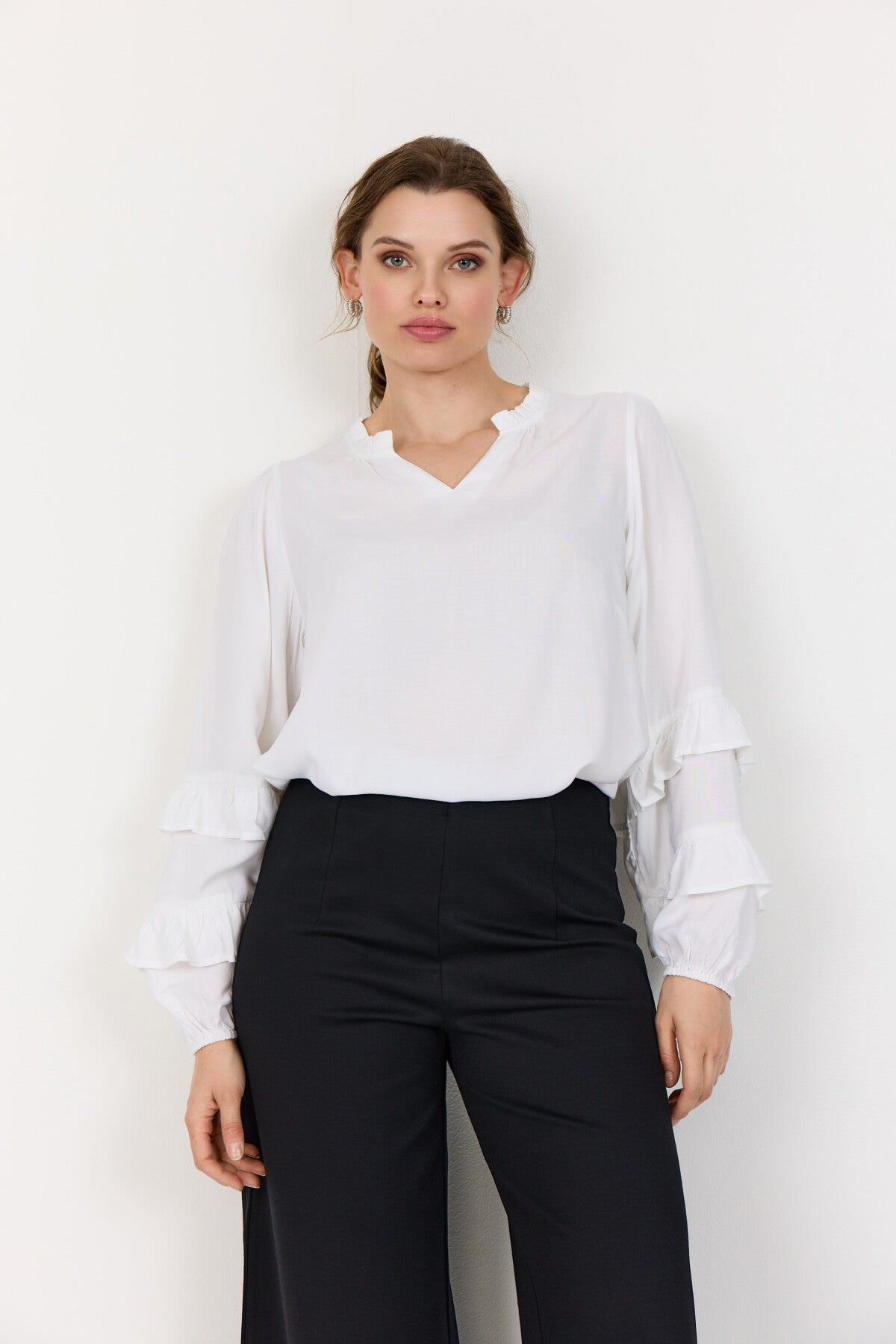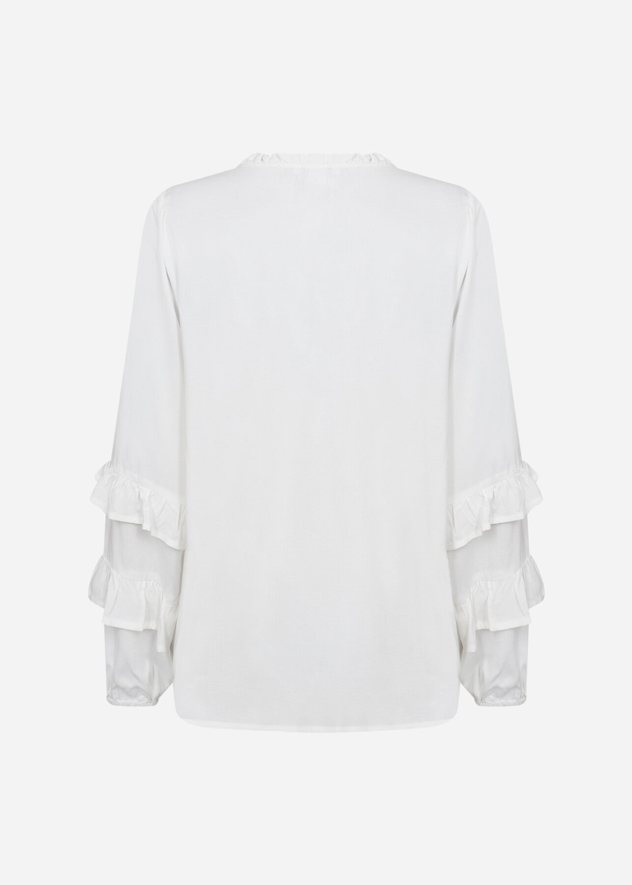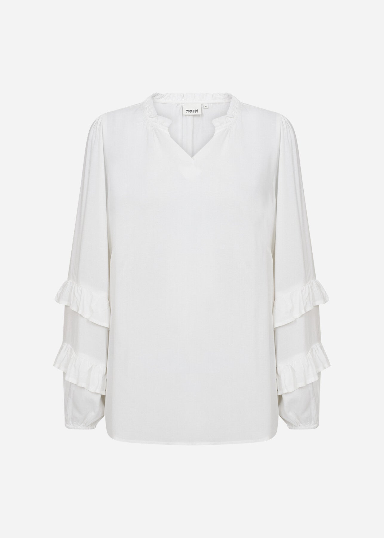 WA-SIA 38 ist eine schöne Bluse aus 100% LENZING™ ECOVERO™ Viskose. Sie hat einen gerüschten Ausschnitt, einen Knopfverschluss, lange Ärmel mit Rüschendetails und eine lockere Passform. Kombinieren Sie sie mit einer maßgeschneiderten Hose oder einem Rock für einen stilvollen Look.