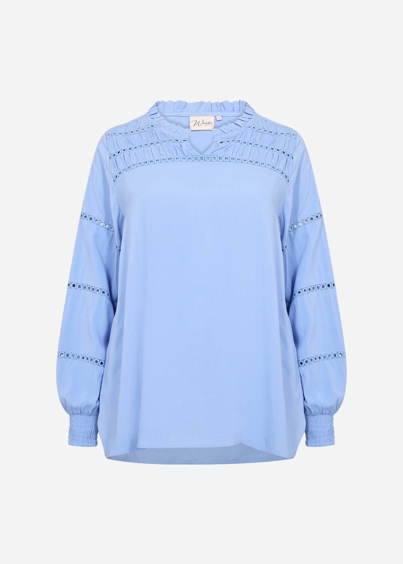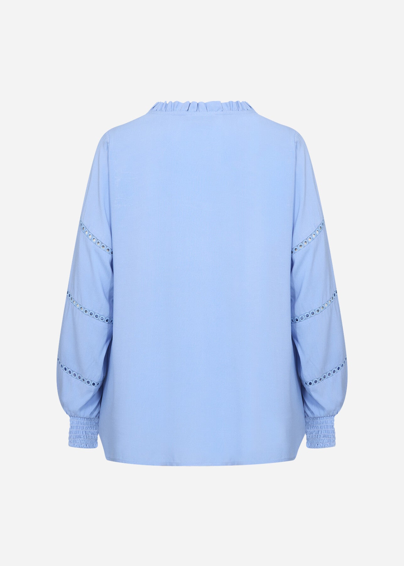 WA-SIA 32 ist eine Bluse aus 100% LENZING™ ECOVERO™ Viskose. Sie hat einen zarten Rüschenkragen mit dezentem V-Ausschnitt, Ösendetails und lange Ärmel mit gerafften Manschetten. Kombiniere sie mit einer maßgeschneiderten Hose für einen raffinierten Look oder mit Jeans für einen lässigen Stil.
