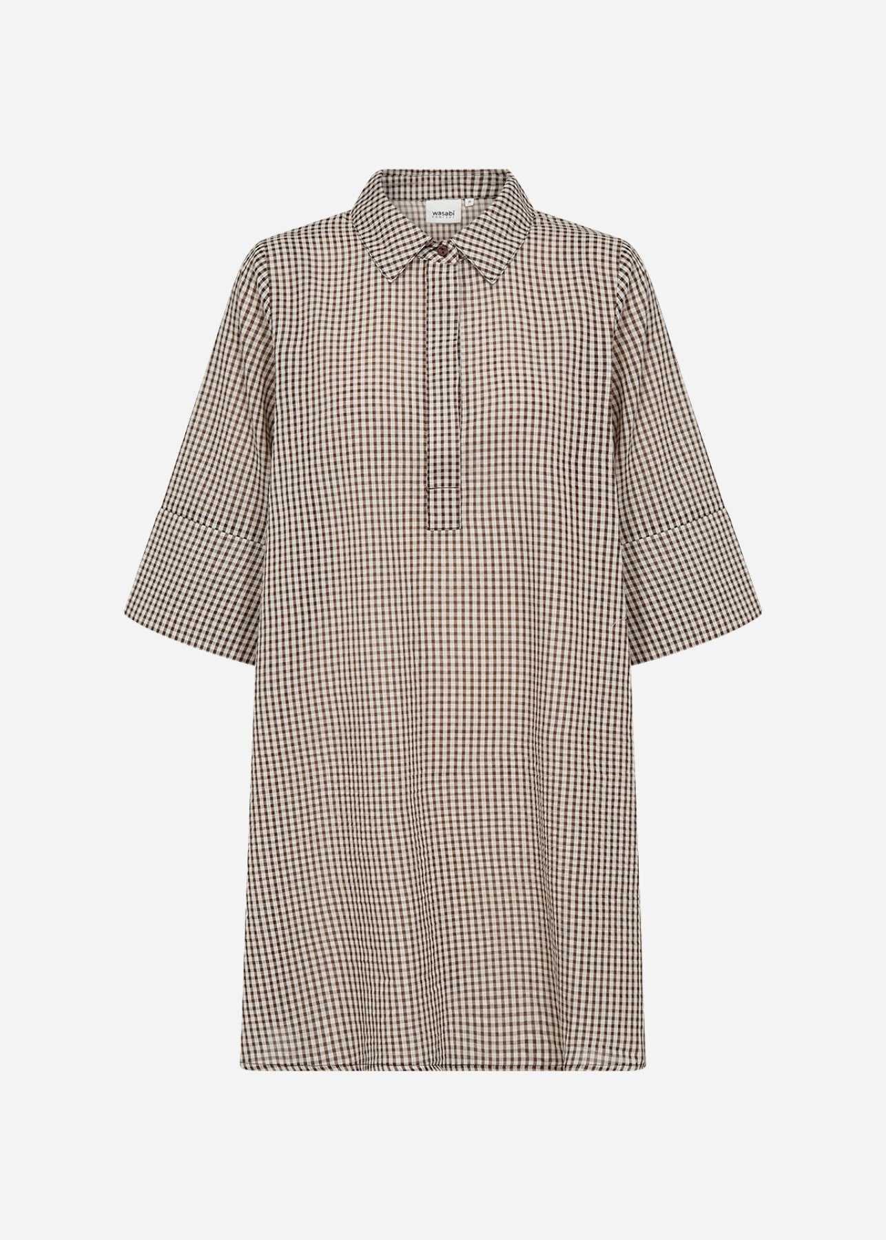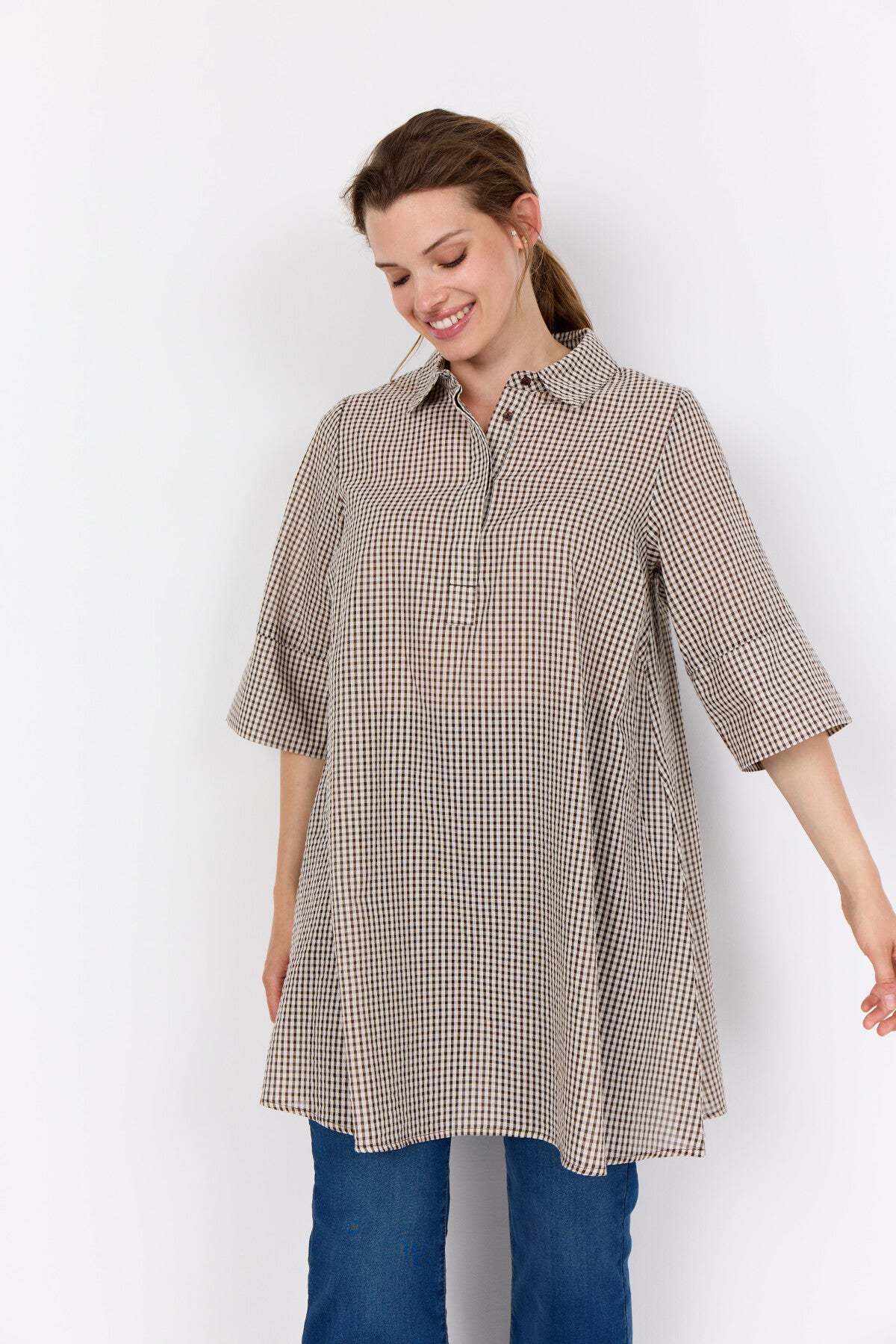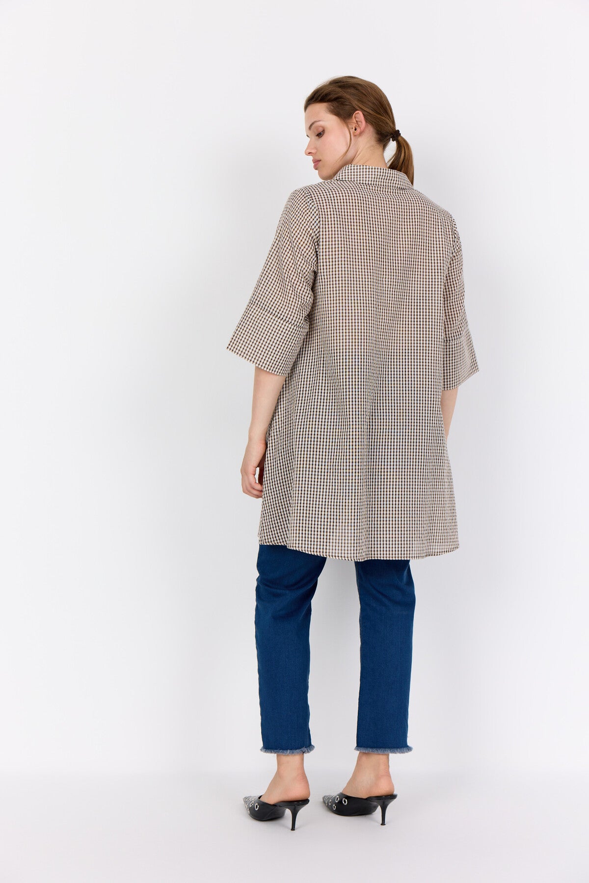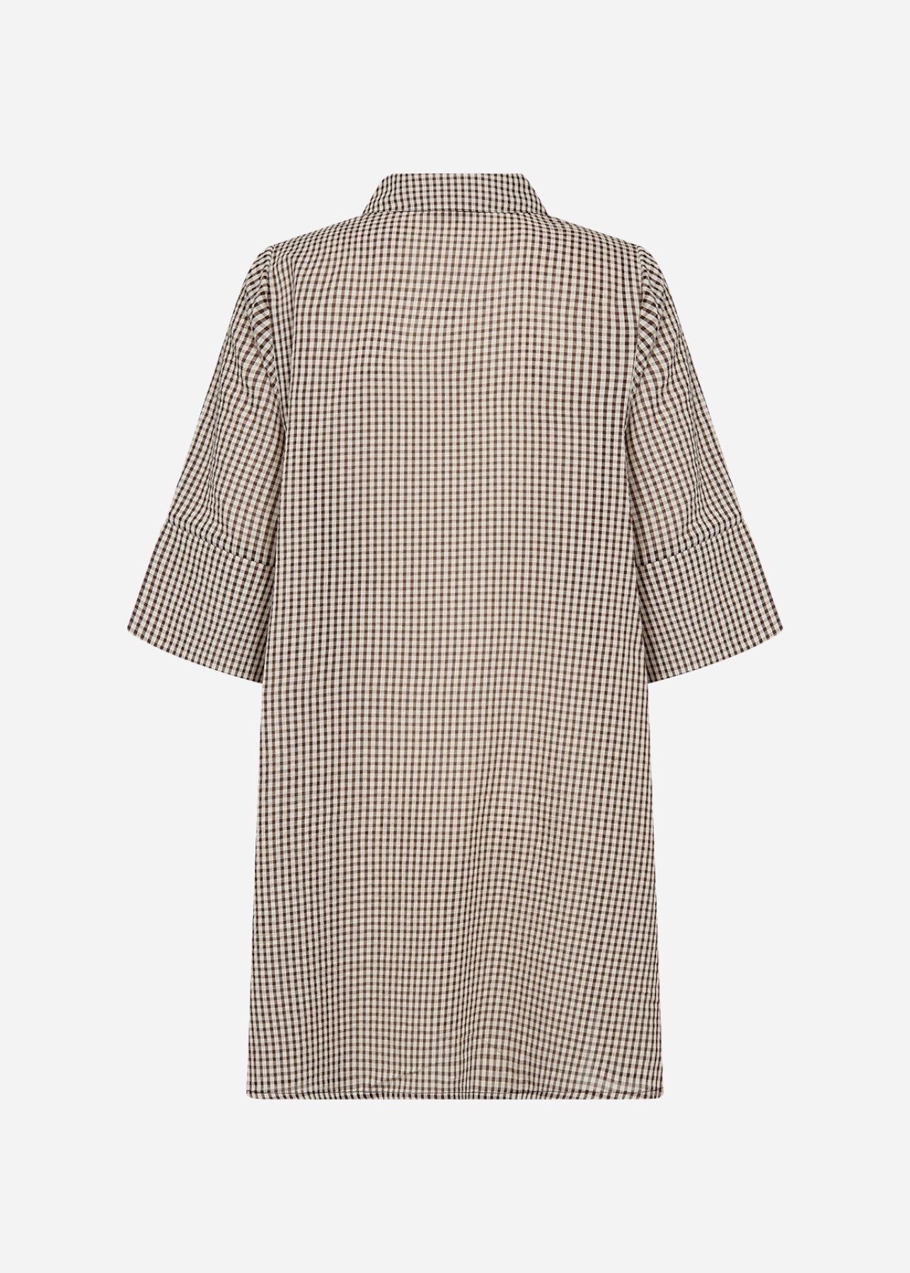 WA-SAINA 3 ist eine klassische Tunika aus 100% Bio-Baumwolle. Sie hat einen klassischen Kragen mit dezenten Knöpfen und ein zartes Karomuster, das ihr einen Hauch von Eleganz verleiht. Kombinieren Sie sie mit Jeans oder Leggings für einen coolen, entspannten Look.