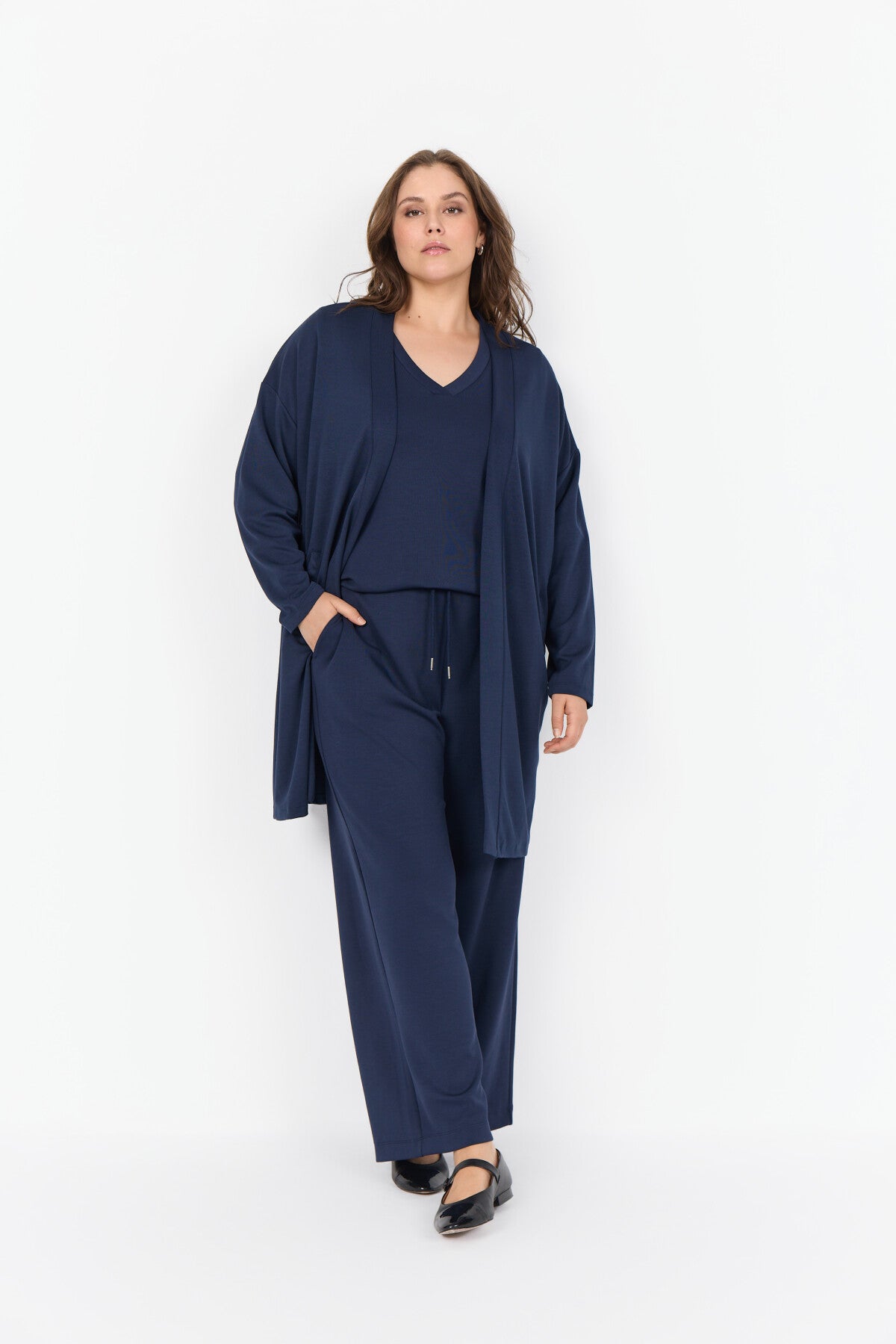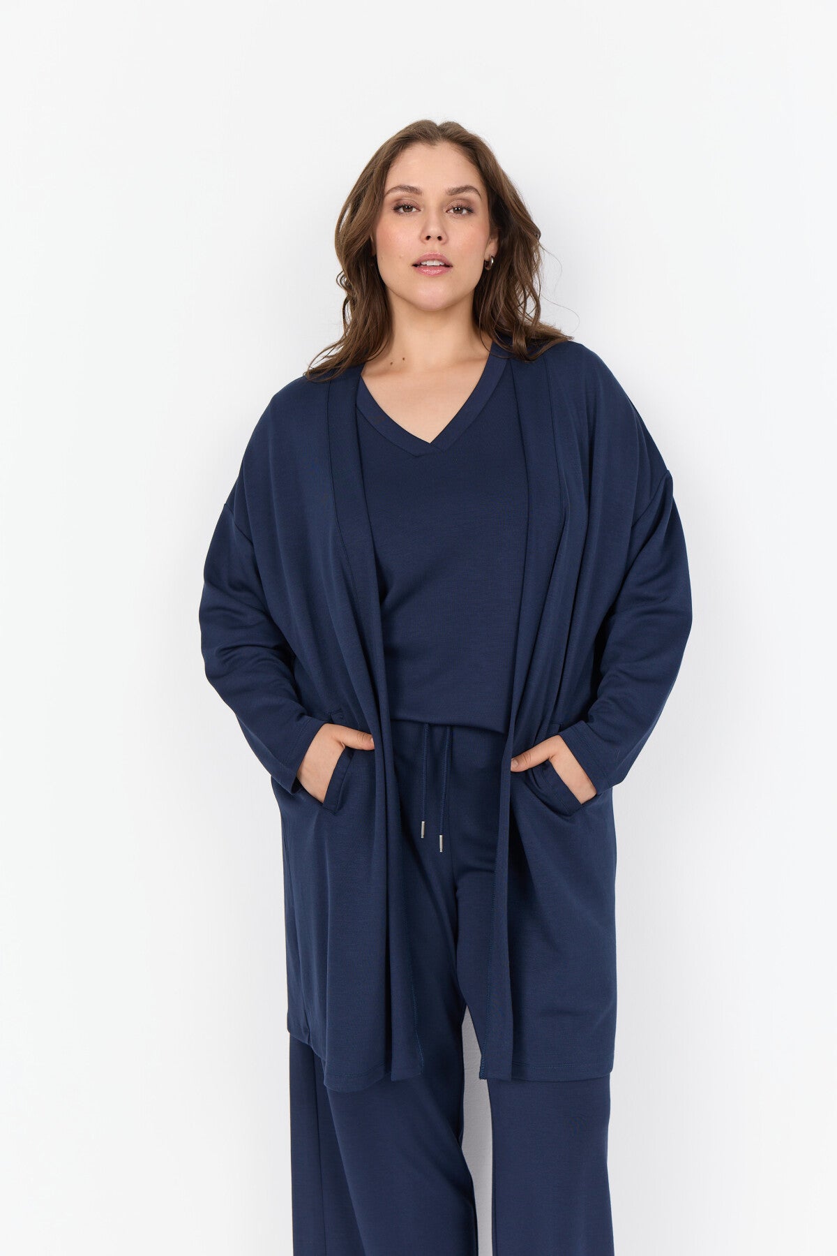 Die WA-SABINA 23 Strickjacke ist aus einer Mischung aus 48% Modal, 48% Polyester und 4% Elastan gefertigt. Die Strickjacke ist vorne offen und hat einen Schalkragen. Kombiniere sie mit einer maßgeschneiderten Hose für einen coolen Look oder trage sie über einem Kleid für ein stilvolles Finish.