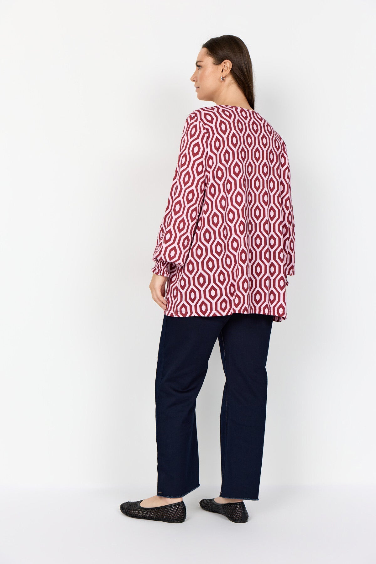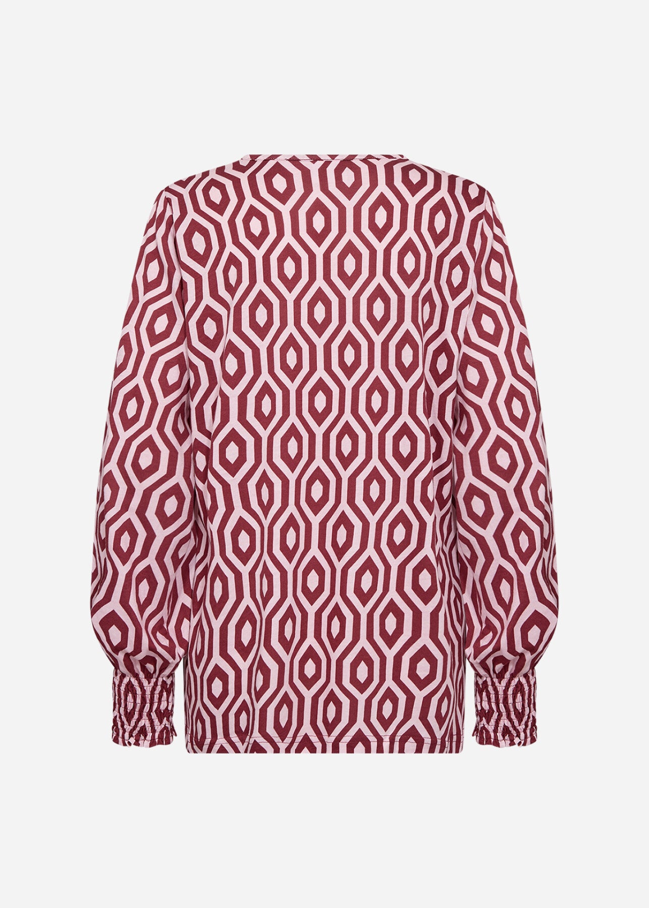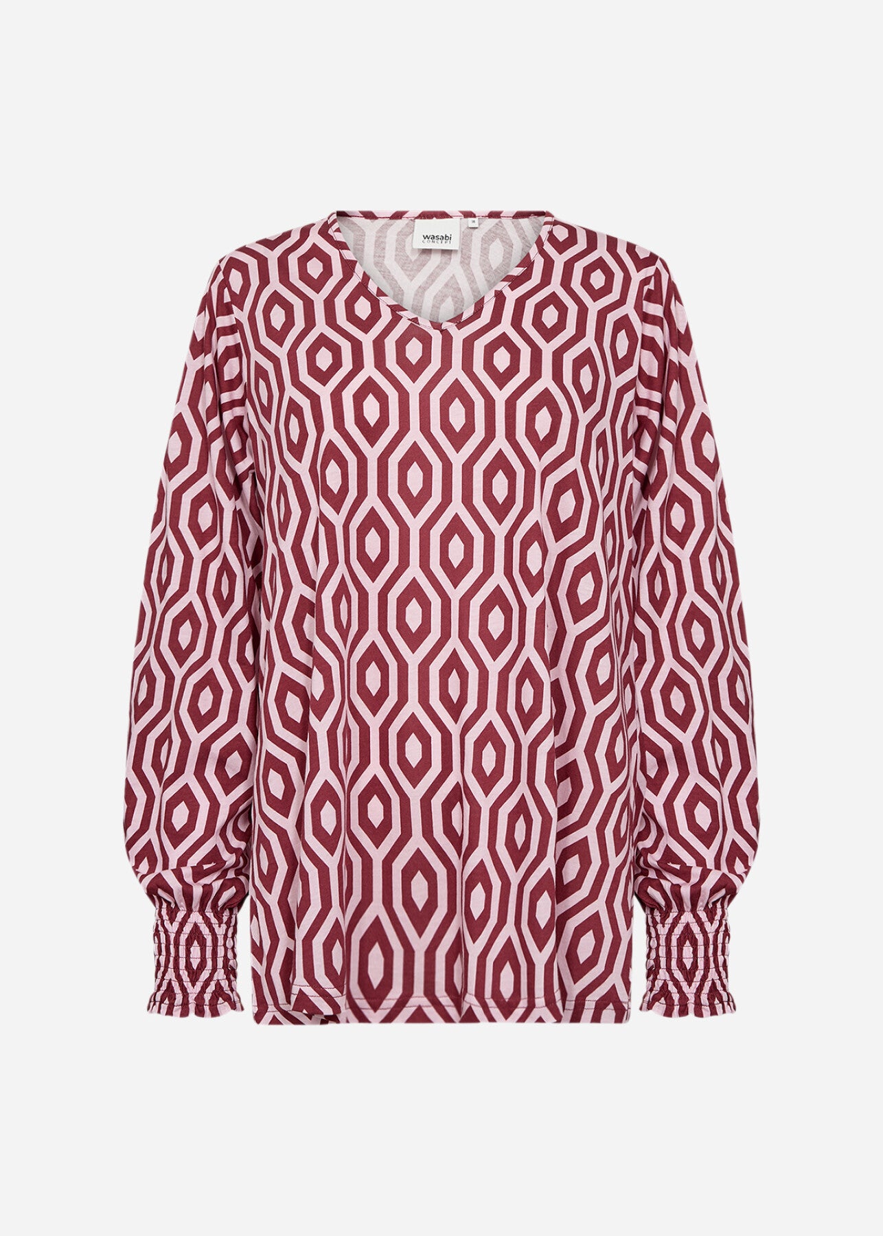 WA-CENETTE 2 ist eine feminine Bluse aus 50% Bio-Baumwolle und 50% Viskose. Sie hat einen geometrischen Print, einen weichen V-Ausschnitt, eine lockere Passform und lange Ärmel mit gerafften Bündchen. Kombinieren Sie dieses elegante Oberteil mit einer maßgeschneiderten Hose oder einem Rock für einen coolen Look.