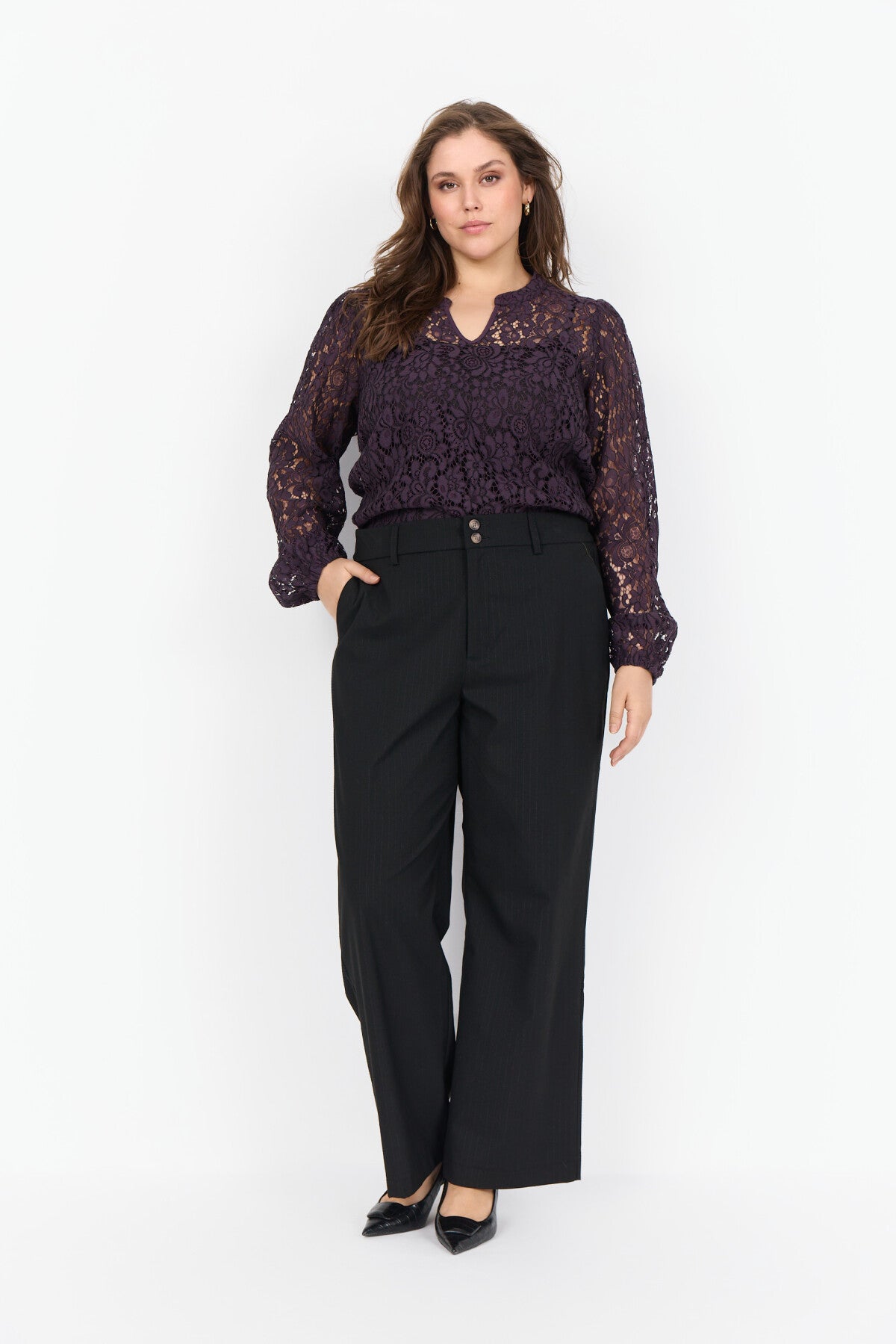 WA-Kila 1 ist eine feminine Bluse aus einer schönen Mischung aus Polyester, Baumwolle und Nylon. Die Bluse hat einen schmeichelhaften Rundhalsausschnitt, lange Ärmel, eine lockere Passform und ein einzigartiges Spitzenmaterial. Kombinieren Sie sie mit einer Anzughose und einem Blazer für einen raffinierten Look.