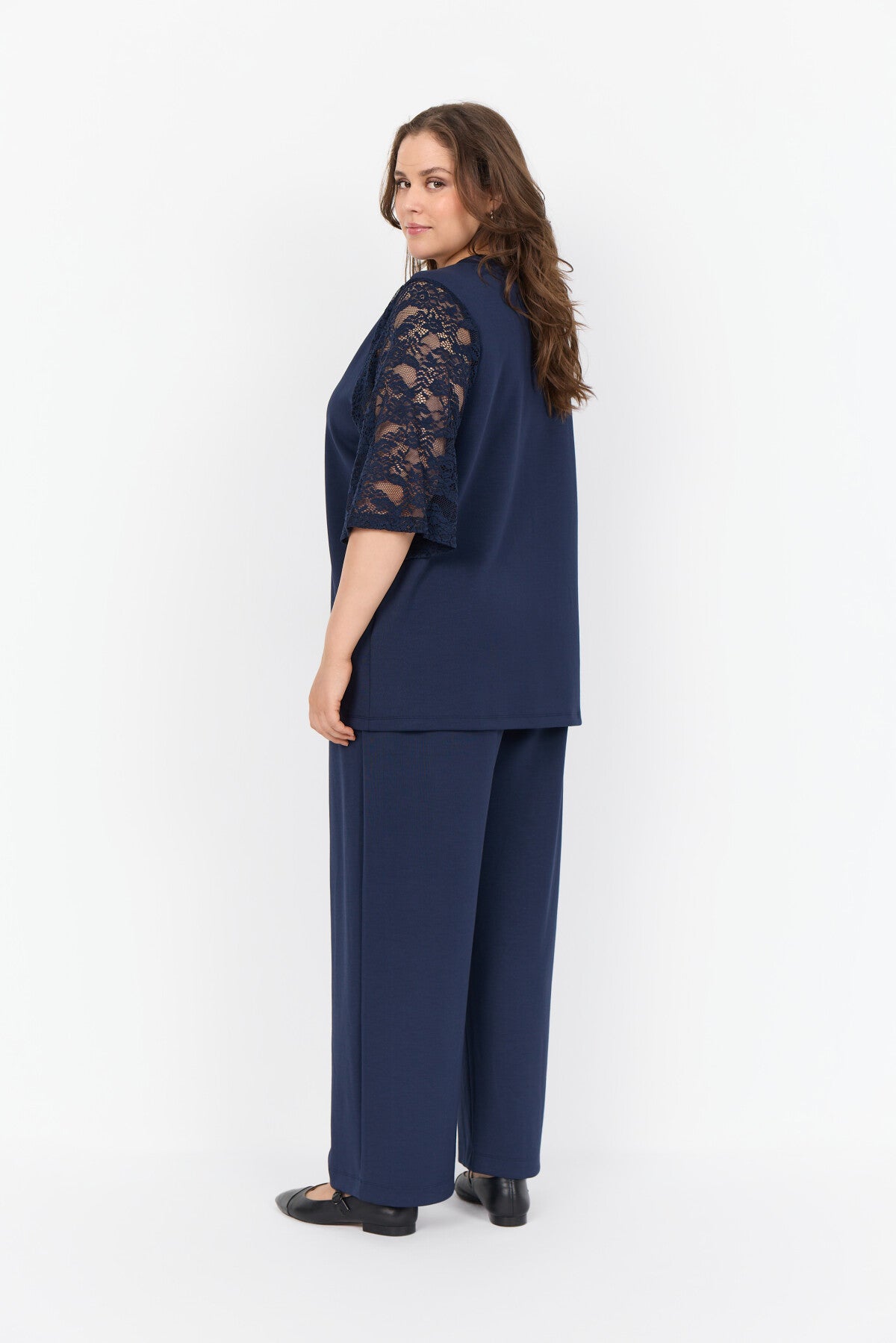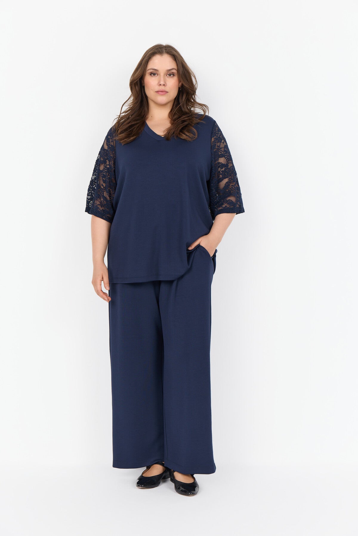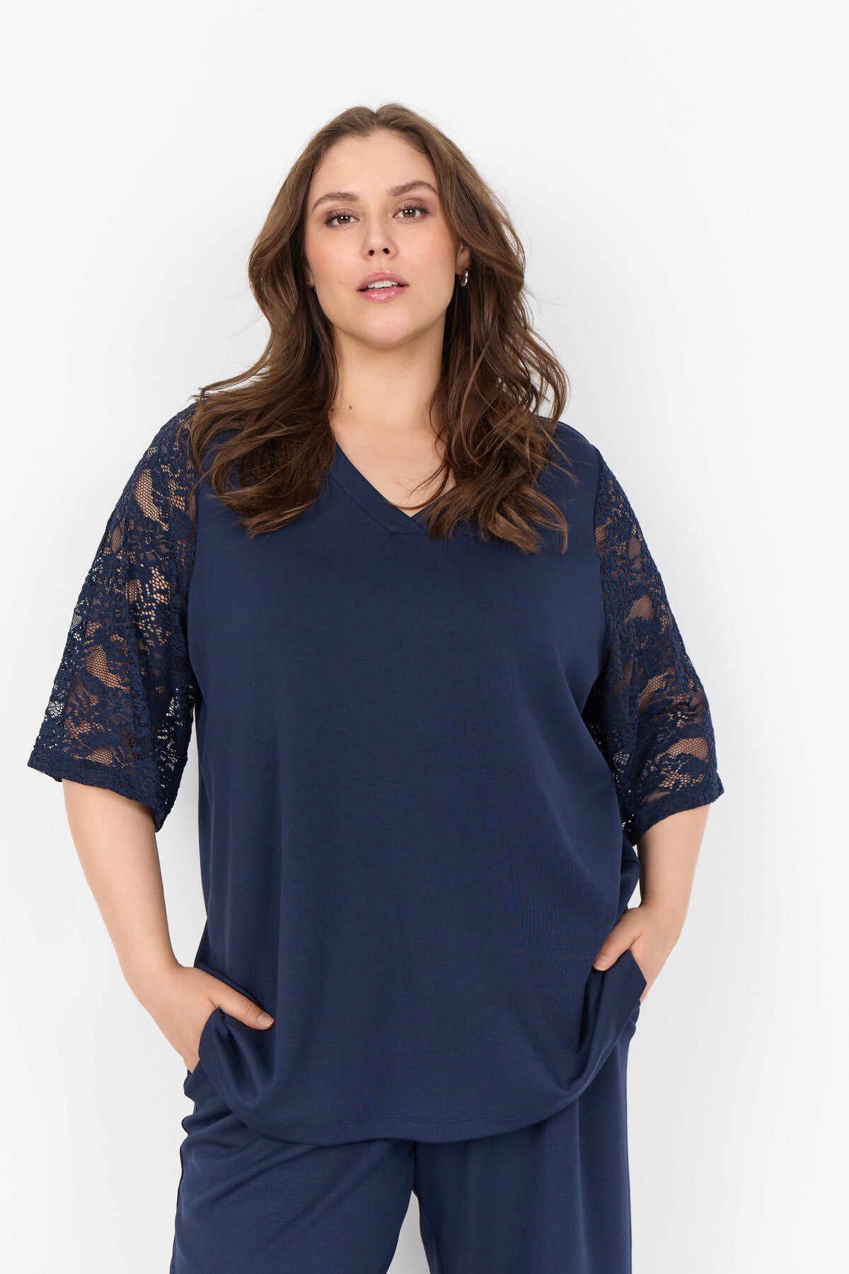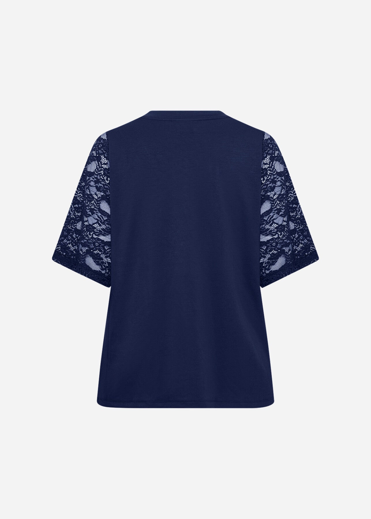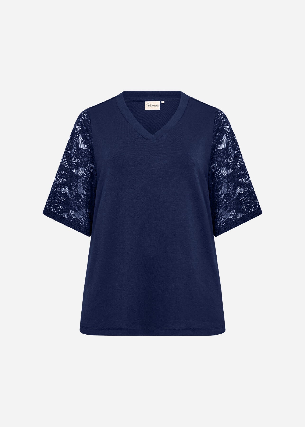 Das WA-SABINA 65 T-Shirt ist aus 48% Modal, 48% Polyester und 4% Elastan gefertigt. Es hat elegante Spitzenärmel und einen schmeichelhaften V-Ausschnitt. Kombiniere es mit deiner Lieblingsjeans oder einem eleganten Rock für einen coolen und einzigartigen Look.