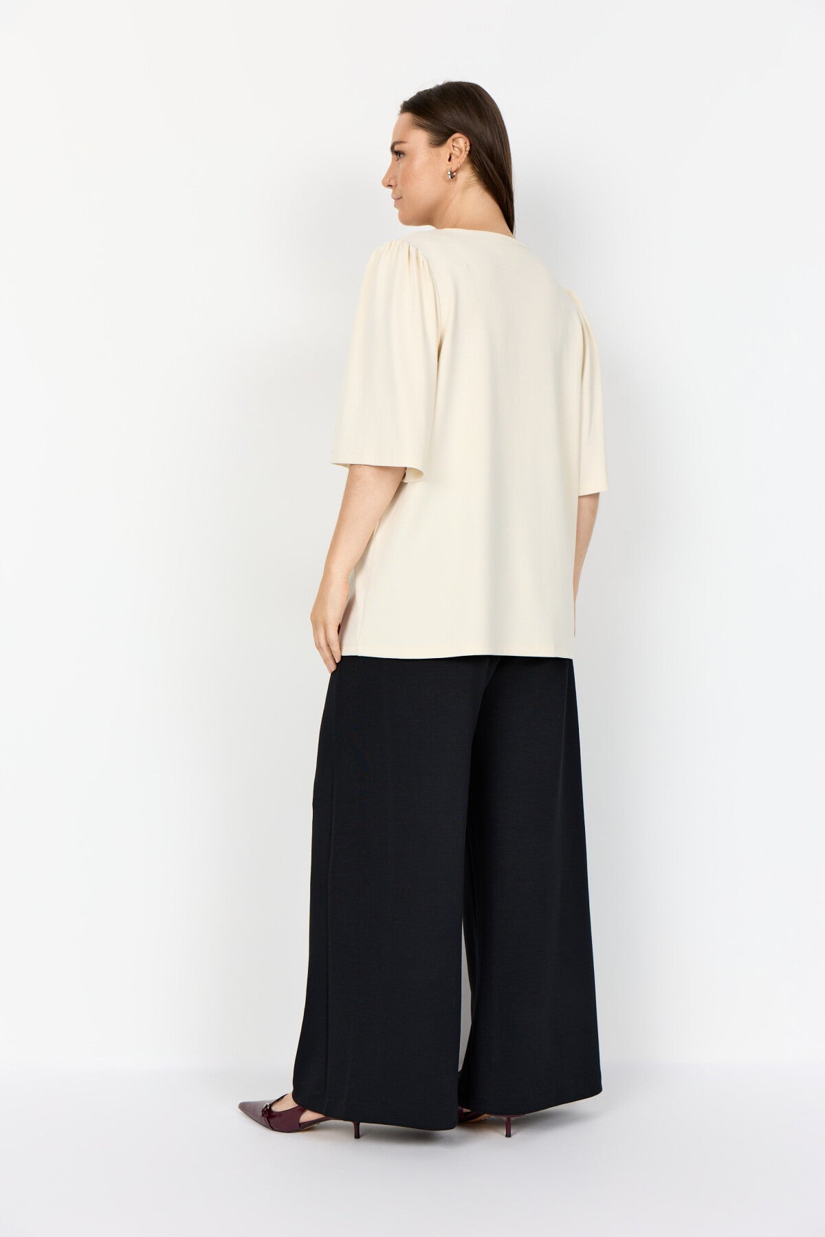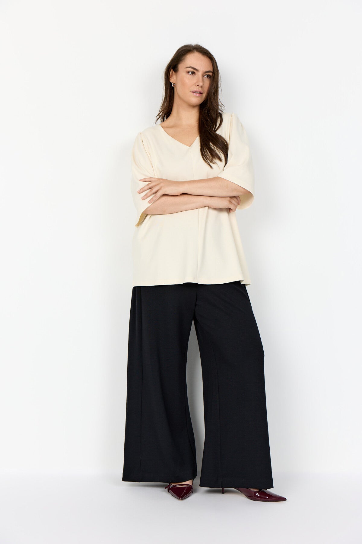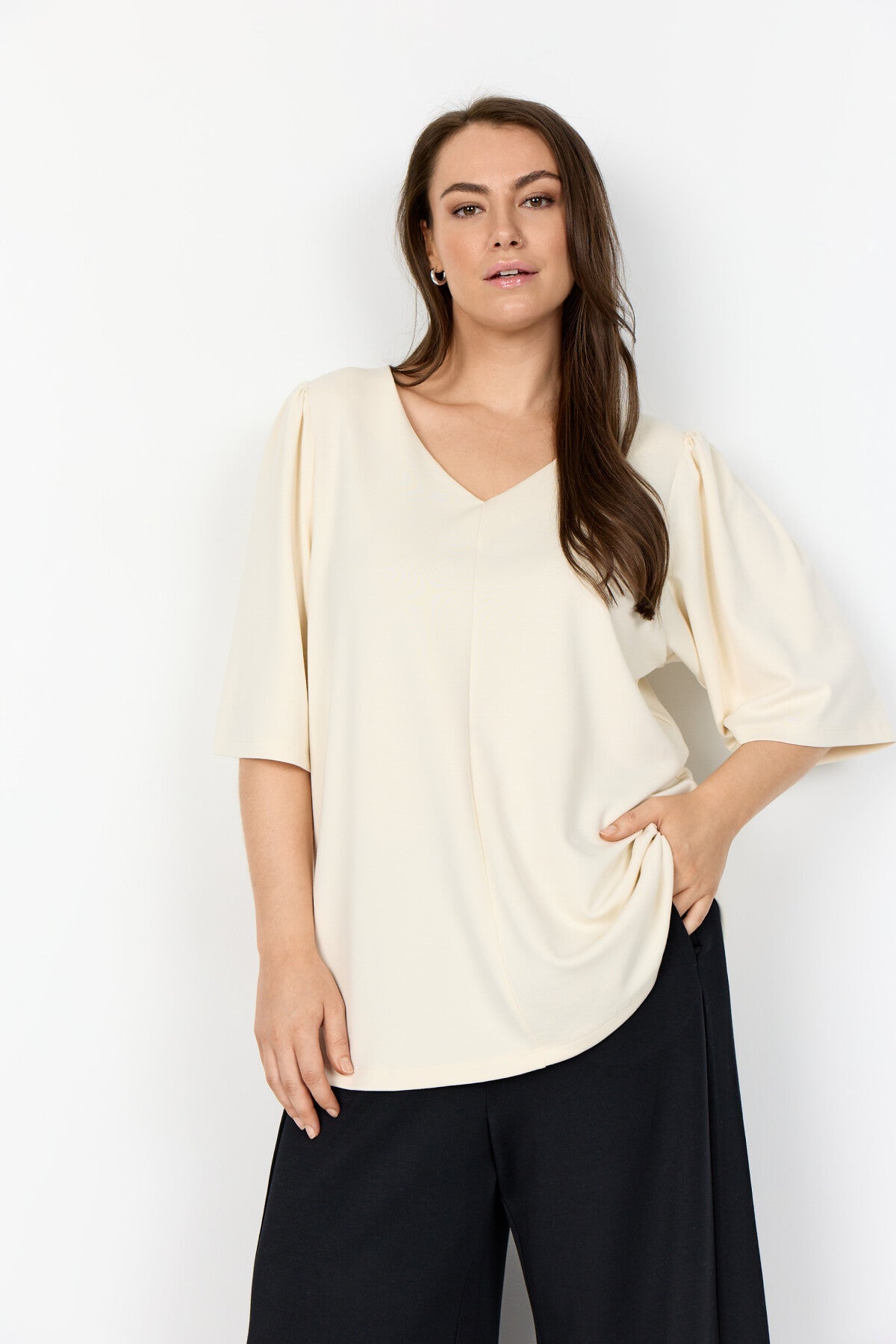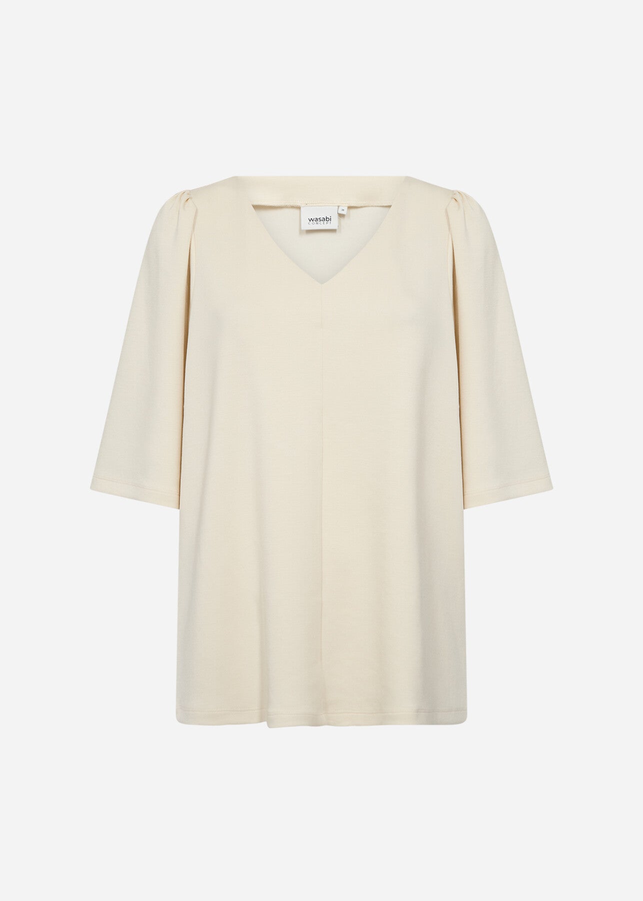 WA-SABINA 70 ist eine klassische Bluse aus 48% Modal, 48% Polyester, 4% Elastan. Sie hat einen eleganten V-Ausschnitt, weiche Falten an den Schultern, dreiviertellange Ärmel und eine lockere Passform. Kombinieren Sie sie mit einer maßgeschneiderten Hose für einen eleganten und raffinierten Look oder mit einem langen Jeansrock für ein legeres Outfit.