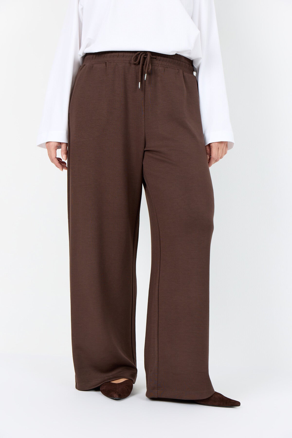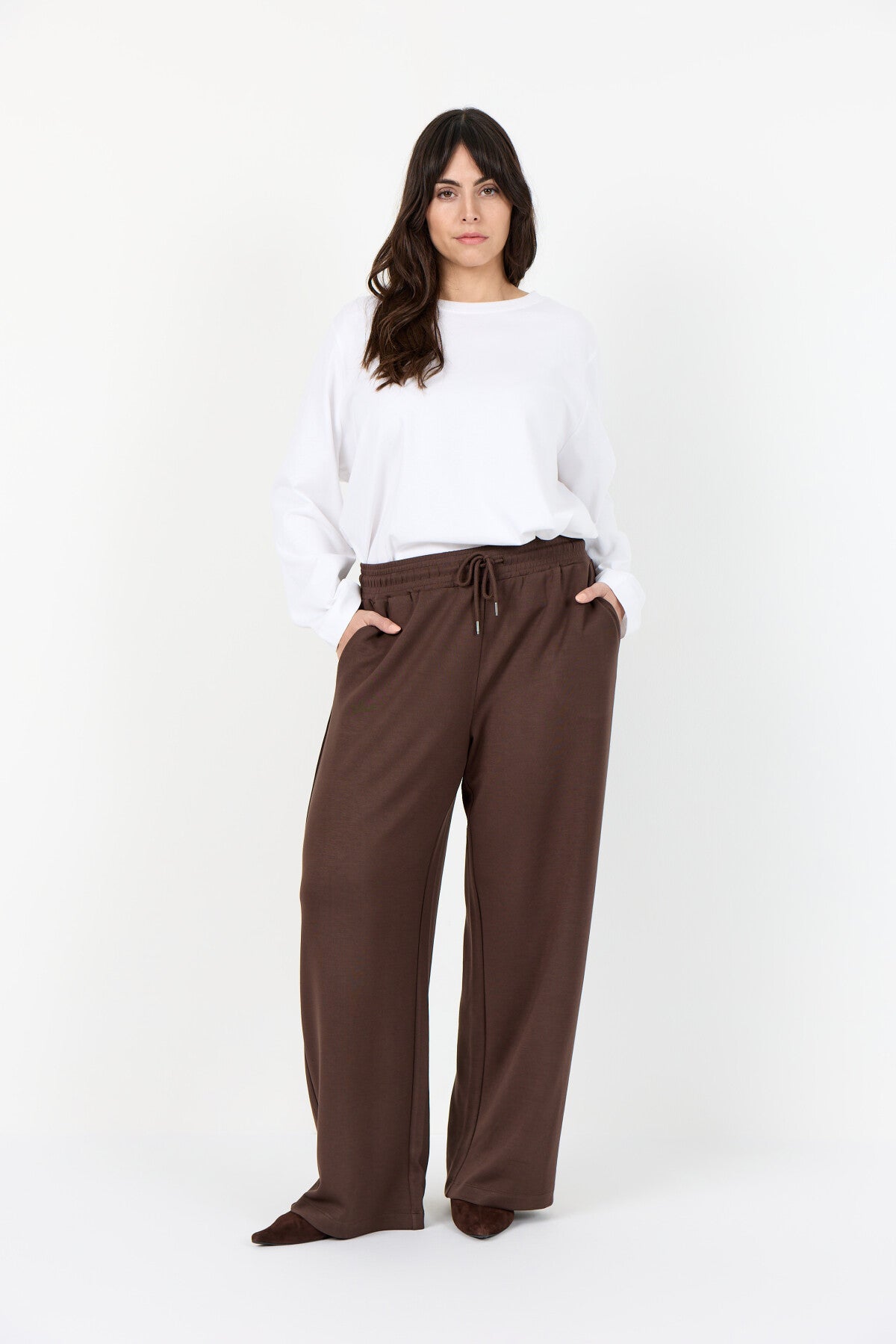 WA-SABINA 80 sind bequeme Pants aus 48% Modal, 48% Polyester und 4% Elastan. Das Design zeichnet sich durch einen elastischen Bund mit verstellbaren Kordelzügen und eine entspannte, bodenlange Passform aus. Kombinieren Sie diese elegante Hose mit einem einfachen Oberteil und Sneakers für einen bequemen Look.